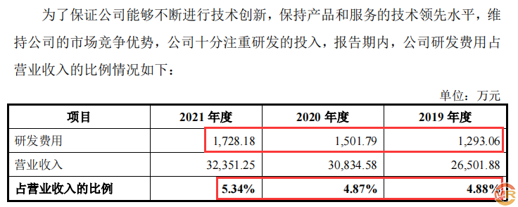 鸿铭股份招股书披露,2019年至2021年公司分别投入研发费用金额为1293.06万元、1501.79万元、1728.18万元,合计研发费用为4523.03万元,低于最近三年研发投入金额累计在6000万元以上标准。公司研发费用分别占同期营业收入比为4.88%、4.87%、5.34%,近2021年研发费用达到5%最低红线标准,2019年、2020年均为超过5%红线标准,因此公司研发投入并不符合科创板属性要求。