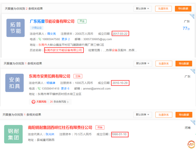 公司副总经理、技术研发中心副经理李指辉,其在2000 年 9 月至 2000 年 12 月,就职于东莞市欧文节能设备有限公司,担任工模部绘图员,而东莞市欧文节能设备有限公司成立于2017年03月22日;副总经理、市场营销中心国内销售部二部经理王兵,其在2001 年 1 月至 2004 年 12 月,就职于东莞市安美扣具有限公司,担任业务经理,而东莞市安美扣具有限公司成立于2010年10月29日;总经理助理余增峰,其在1996 年 1 月至 2002 年 9 月,就职于南阳钢耐集团西峡红柱石有限责任公司,担任计量处职员,而南阳钢耐集团西峡红柱石有限责任公司成立于1998年01月10日。