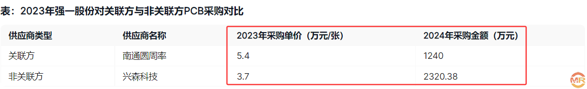 面对质疑,强一股份辩解称“采购数量多享折扣”,但数据却戳破了这一说法。2024年,公司向南通圆周率的采购金额为1240万元,而向兴森科技的采购金额达2320.38万元——前者采购量明显低于后者,所谓“数量优势”根本无从谈起。更关键的是,公司始终未披露该型号PCB的成本构成:无论是基材差异、加工工艺复杂度,还是其他可能影响定价的因素,均无具体数据支撑。高价采购的合理性成谜,定价公允性沦为空谈。