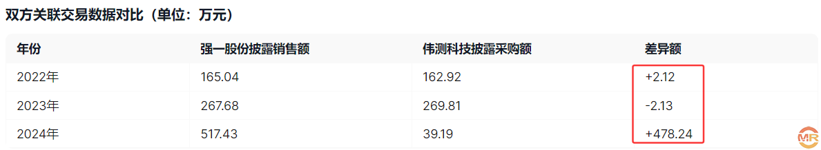 值得注意的是,2022年、2023年的差异尚在2万元左右,或可归因于统计口径差异(如是否包含增值税、子公司范围是否一致),但2024年的差异却突然扩大至478.24万元——强一股份披露的销售额是伟测科技采购额的13.2倍。这种"断崖式"矛盾难以用常规解释覆盖:若强一股份数据属实,伟测科技可能存在漏报关联采购;若伟测科技数据准确,强一股份则可能虚增收入。无论哪种情况,均指向至少一方信披存在重大瑕疵。