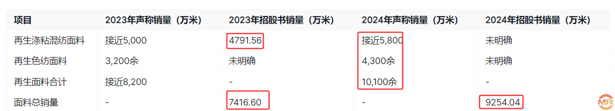 公司以销量占国内产量的比例来定义市场占有率,但未明确说明是否排除了出口或其他非国内销售部分。更重要的是,其销量数据本身就有夸大嫌疑。例如,公司称2023年再生涤粘混纺面料销量“接近5,000万米”,但招股书实际披露仅为4791.56万米,相差208.44万米。这种模糊表述与精确数据的差距,直接影响了市场占有率的可信度。