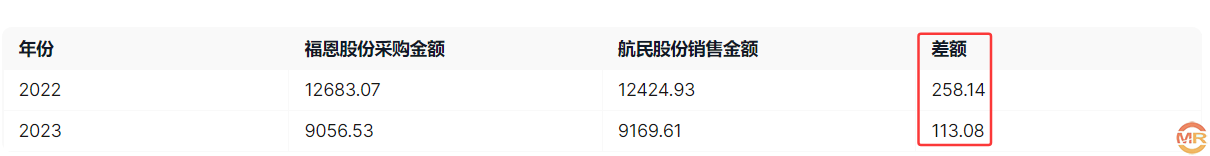 更令人困惑的是,类似情况在2023年再次上演。福恩股份招股书显示,当年向航民股份采购金额为9056.53万元,而航民股份年报披露的同期对第三大客户销售金额为9169.61万元,双方数据相差113.08万元。