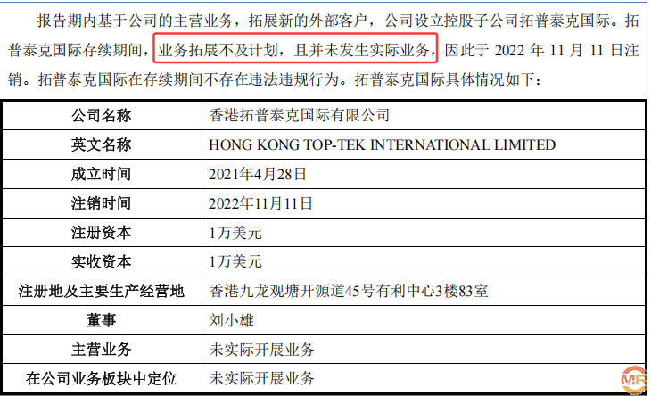 2021年4月,拓普泰克国际正式成立,股权结构显示,拓普泰克香港持有60%股份,而钟明禺控制的香港安域实业有限公司则持股30%,另一家深圳市芳静投资合伙企业持有剩余10%。这家子公司的注册资本仅为1万美元,看似是一次普通的海外扩张尝试。然而,其后续发展却出乎所有人意料。在短短一年七个月后,即2022年11月,拓普泰克国际被注销,注销时点净资产为负4512.26万元,当年净利润亏损高达2162.80万元。