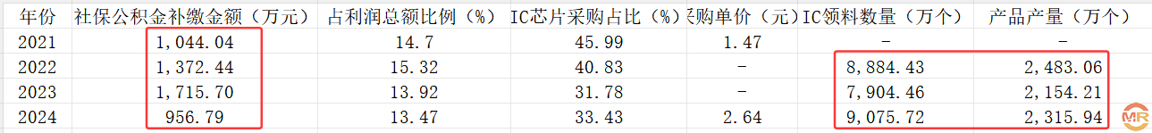 更令人困惑的是,公司产量与原材料领用数据严重不匹配。以IC芯片为例,2022年领料数量为8,884.43万个,同期产品产量仅为2,483.06万个;2023年领料数量降至7,904.46万个,产量也随之下滑至2,154.21万个。然而,2024年领料数量回升至9,075.72万个,接近2022年水平,产量却仅为2,315.94万个,低于2022年。这种反常逻辑,难以用简单业务调整解释。