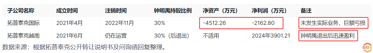 这张表格不仅突出了两家子公司的命运反差,更暗示了可能的利益转移:拓普泰克国际承担了亏损,而越南子公司在钟明禺退出后成为盈利引擎。如果这些交易存在不公,少数股东和潜在投资者可能成为最终受害者。