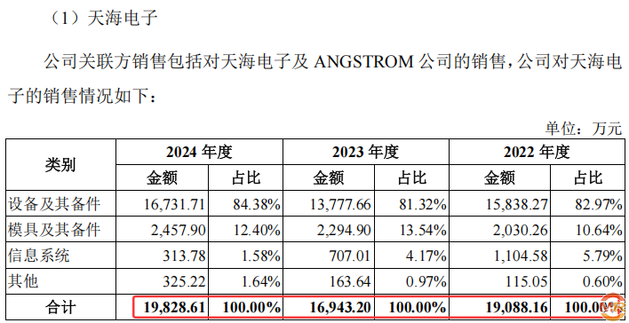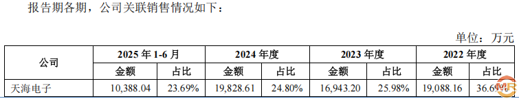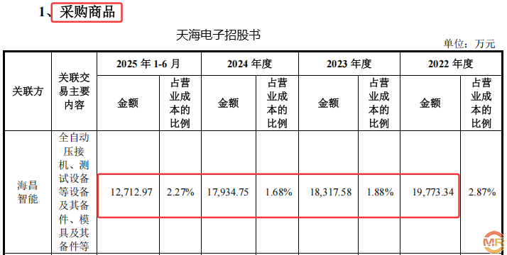 根据海昌智能招股书披露,2022年至2024年,公司对关联方天海电子的销售金额分别为19088.16万元、16943.20万元和19828.61万元。然而,天海电子在深交所主板的招股材料中显示,同期对海昌智能的采购金额分别为19773.34万元、18317.58万元和17934.75万元。双方披露的数据差异从2022年的645.18万元,一路扩大至2024年的1893.86万元,呈现明显的逐年递增趋势。