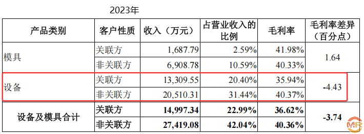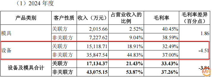 更值得玩味的是设备与模具销售的毛利率对比。2023年至2024年,海昌智能对关联方销售设备的毛利率分别为35.94%和32.49%,低于非关联方的37.00%和40.37%,差额达4.51%和4.43%。设备销售是公司主营业务,关联交易中的低价策略可能虚增收入规模,却损害了盈利能力。