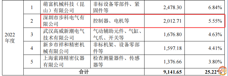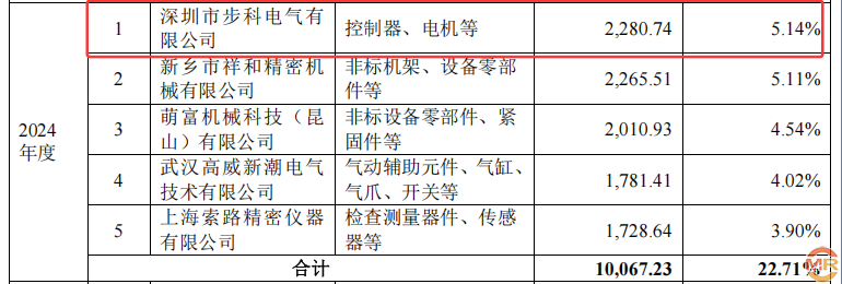 在供应商信息披露方面,海昌智能与上市公司子公司的数据差异尤为醒目。据招股书显示,2024年海昌智能向第一大供应商深圳市步科电气有限公司采购控制器、电机等金额为2280.74万元。然而,步科电气母公司步科股份作为科创板上市公司,其2024年报披露的前两大客户销售金额分别为2390.01万元和2180.37万元,均与海昌智能披露的采购金额无法对应。