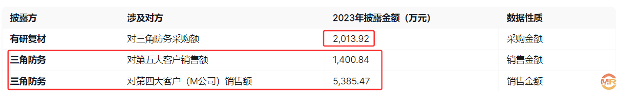 然而,查阅三角防务2023年年度报告,其披露的前五大客户销售情况却呈现另一番景象。年报显示,其第五大客户为陕西三原海航工贸有限公司,销售金额1400.84万元;第四大客户为“M公司”,销售金额5385.47万元。无论从哪个角度看,2013.92万元这一数字均未出现。若假设“M公司”即为有研复材,则两家公司披露的交易金额相差超过3370万元,差异巨大。