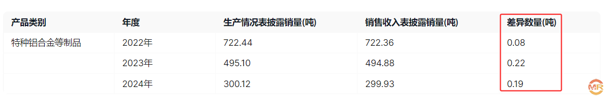 如果说近期数据差异可能源于工作繁忙,那么历史数据的不一致则进一步动摇了其信披基础的可靠性。对于特种铝合金制品和其他特种合金制品,2025年1-6月的数据是一致的,但2022年至2024年的数据却出现了“打架”现象。