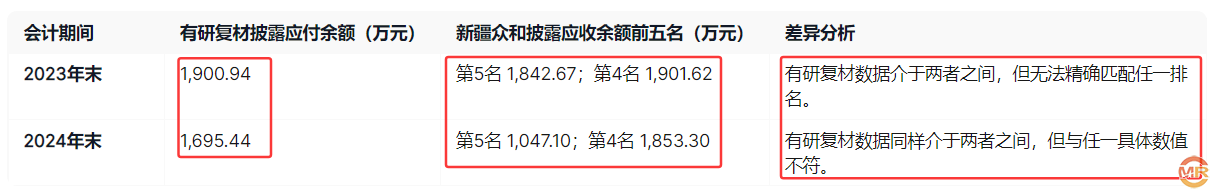 另一处矛盾出现在与供应商新疆众和的往来款项上。有研复材招股书显示,2023年末、2024年末,公司对新疆众和的应付账款余额分别为1900.94万元和1695.44万元。但新疆众和同期年报却给出了不同的应收账款数据。2023年末,其第五大和第四大应收账款客户余额分别为1842.67万元和1901.62万元;2024年末,对应的数据为1047.10万元和1853.30万元。