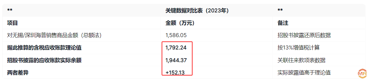按照基本的财务逻辑,以13%的增值税率计算,这笔1,586.05万元的销售业务,理论上形成的含税应收账款应为1,586.05万元 × (1+13%) = 1,792.24万元 。然而,在招股书的“关联应收应付款项”部分,公司明确列示2023年末对无锡海普的应收账款余额为 1,944.37万元。