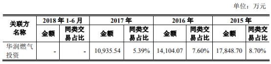 2015年-2017年及2018年1-6月,成都燃气接受华润工程的工程施工服务金额分别为1.30亿元、1.48亿元、1.30亿元、0.97亿元,同类交易占比分别为15.04%、23.91%、19.35%、20.99%。同期成都燃气接受华润设计工程设计服务金额分别为1353.99万元、1519.35万元、963.94万元、401.08万元,同类交易占比均为100%。