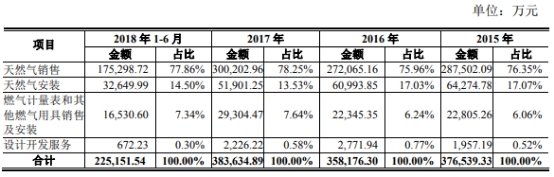 成都燃气产品主要为天然气,2015年-2018年1-6月,天然气销售业务金额分别为28.75亿元、27.21亿元、30.02亿元、17.53亿元,在主营业务收入中占比分别为76.35%、75.96%、78.25%及77.86%;天然气安装业务收入金额分别为6.43亿元、6.10亿元、5.19亿元、3.26亿元,在主营业务收入中占比分别为17.07%、17.03%、13.53%及14.50%。