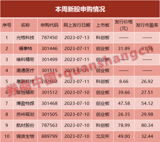 本周(7月10日到7月14日),将有10只新股申购,包括3只科创板新股、6只创业板新股、1只北交所新股。其中,周一(7月10日)共有5只新股,锦波生物是北交所设立以来发行价最高的新股,发行价49元/股。锦波生物曾两次调整发行底价,第一次从117元/股调整到50元/股,第二次从50元/股调整到49元/股。