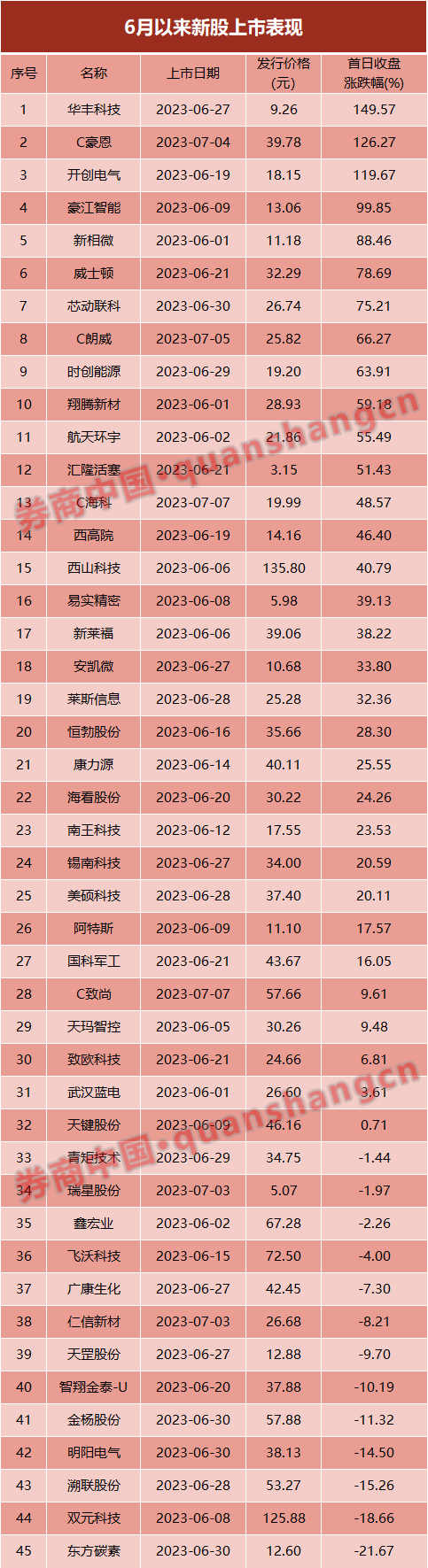 券商中国记者梳理发现,6月以来,一共有45只新股上市,整体破发概率在29%左右。就破发新股而言,整体破发幅度不大,基本都在20%以内。华安证券7月3日研报表示,下期打新收益有一定概率增加,建议投资者近期参与打新持积极态度。