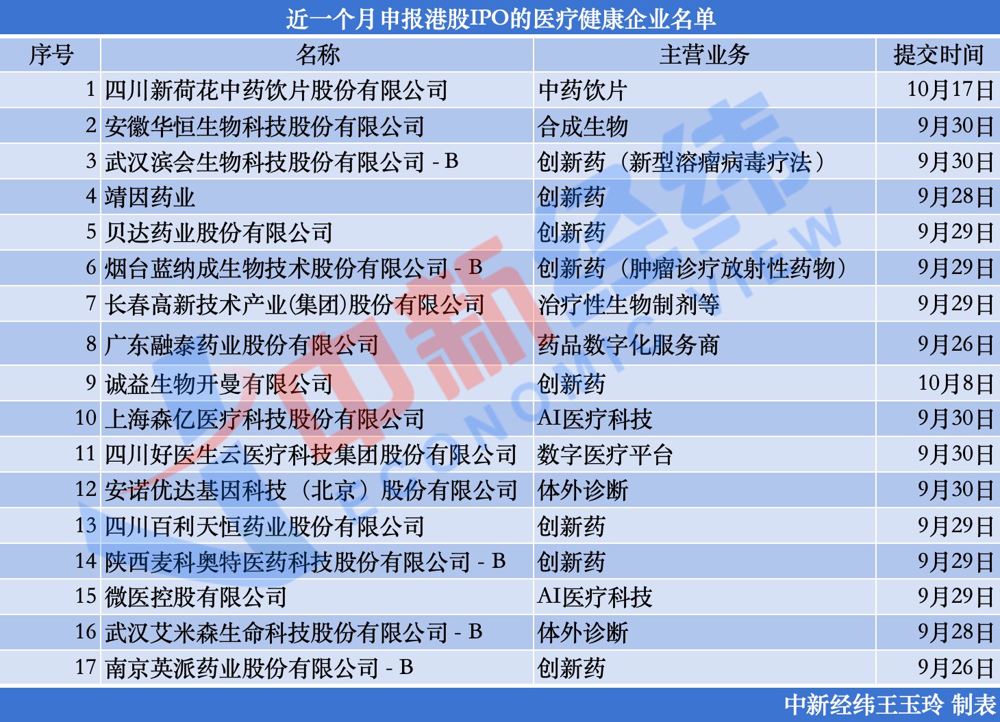 据中新经纬梳理,近一个月内向港交所递交招股书的17家医疗健康企业分别是新荷花、华恒生物(31.960,-0.06,-0.19%)、滨会生物、靖因药业、贝达药业(56.360,-1.90,-3.26%)、蓝纳成、长春高新(117.650,-1.46,-1.23%)、融泰药业、诚益生物、森亿智能、四川好医生、安诺优达、百利天恒(351.200,-3.80,-1.07%)、麦科奥特、微医、艾米森和英派药业。