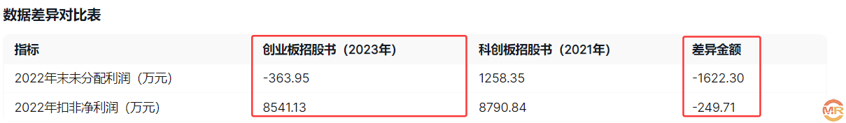 利润数据“前后不一”,未分配利润相差1622万元。据招股书对比,公司2022年末未分配利润在两版文件中呈现“正负反转”:创业板版本显示为-363.95万元,而科创板版本则为1258.35万元,二者相差1622.3万元;同期扣除非经常性损益后归属于母公司所有者的净利润也存在差异,创业板披露8541.13万元,较科创板版本的8790.84万元少249.71万元。核心财务指标的矛盾表述,可能影响投资者对公司盈利能力和财务状况的判断。