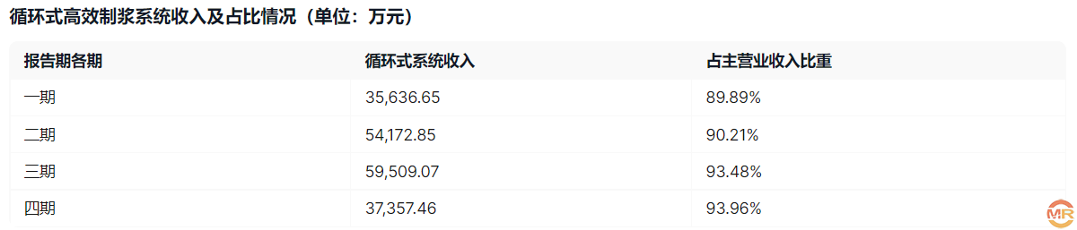 产品结构"一根独苗" 收入超九成依赖单一系统。过度依赖单一产品的风险同样突出。循环式高效制浆系统作为公司主要产品,报告期内收入分别为35,636.65万元、54,172.85万元、59,509.07万元和37,357.46万元,占主营业收入的比重高达89.89%、90.21%、93.48%和93.96%,呈现逐年攀升趋势。