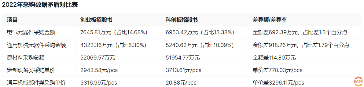 从表格可见,核心原材料采购数据的矛盾堪称“全面开花”:电气元器件采购额相差692.39万元,通用机械元器件采购额相差918.26万元,两者合计差异超1600万元;更荒诞的是采购单价——通用机械部件类在创业板招股书中为3316.99元/pcs,在科创板招股书中却骤降至20.88元/pcs,单价相差3296.11元,降幅达99.37%。即便是定制设备类,单价也相差770.03元,差异率超26%。