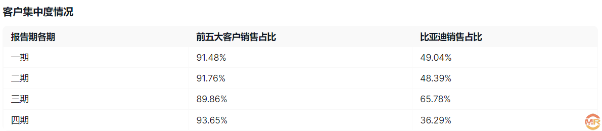客户集中度"爆表" 比亚迪依赖成关联交易隐患。客户层面的风险更触目惊心,报告期内公司对前五大客户的销售占比始终维持在90%左右,分别为91.48%、91.76%、89.86%和93.65%;其中,对比亚迪的销售占比最高达65.78%,最低也有36.29%,且比亚迪持有公司超5%股份,构成关联方,双方交易属关联交易。